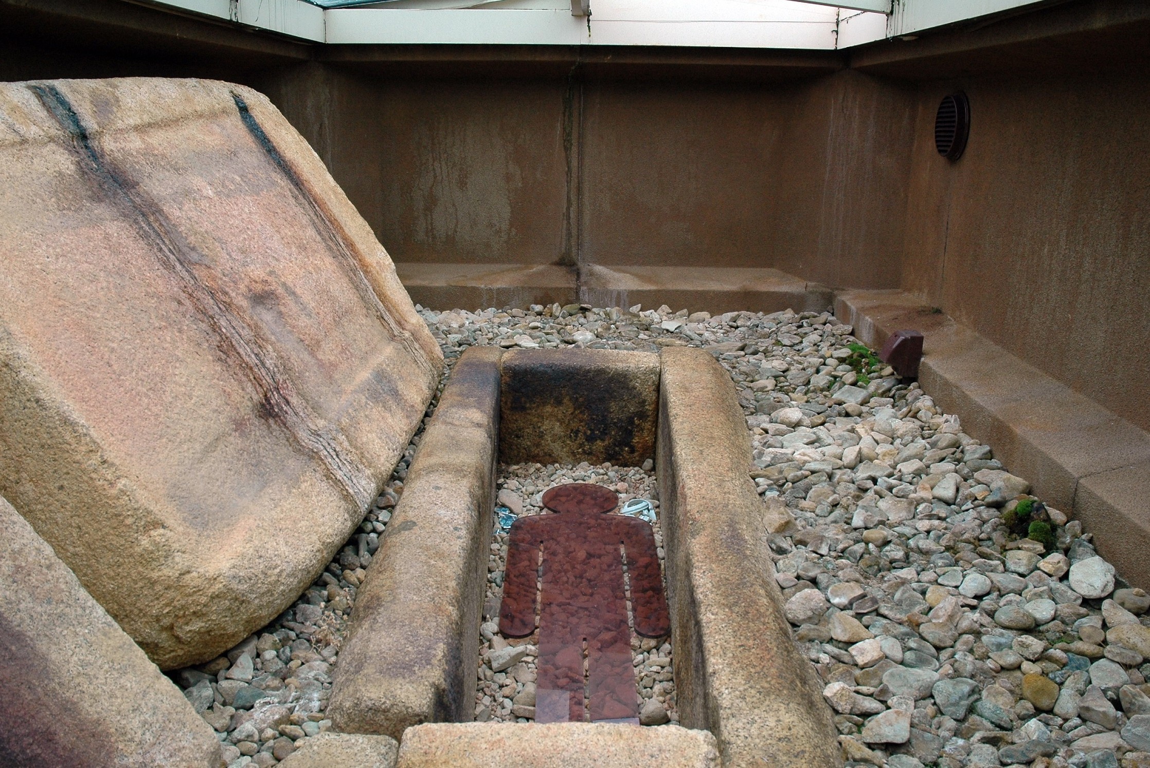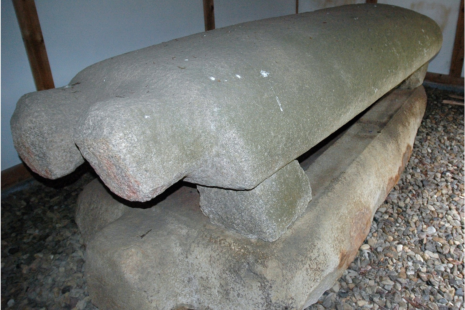 蛭子山1 号墳は日本海三大古墳の一つで墳長145m 。国の史跡に指定され、後円部中央の王の柩では大型の「舟形石棺」が出土し、副葬品は、棺内から鏡、直刀、棺外から直刀、剣身、鉄鏃、鉄斧などが出土しました。