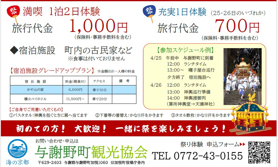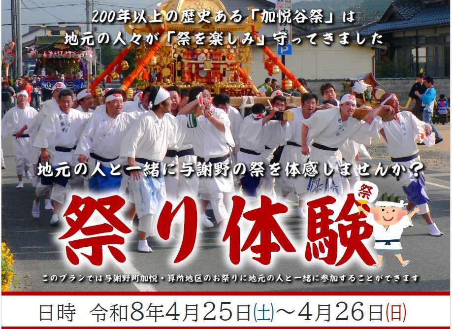 与謝野町観光協会では、4/25・26の土曜、日曜日に開催される「加悦谷祭」を地元住民と楽しむ 「祭り体験」の体験者を募集しております。